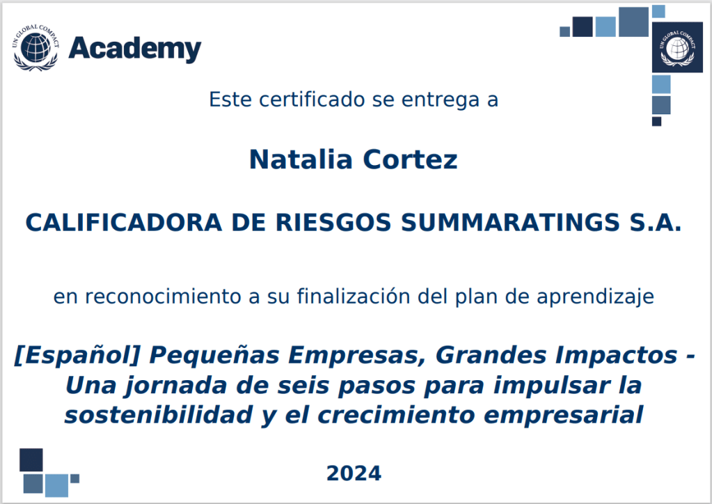 - Pequeñas Empresas, Grandes impactos – Una jornada de seis pasos para impulsar la sostenibilidad y el crecimiento empresarial. UN Global Compact. Online. 2024