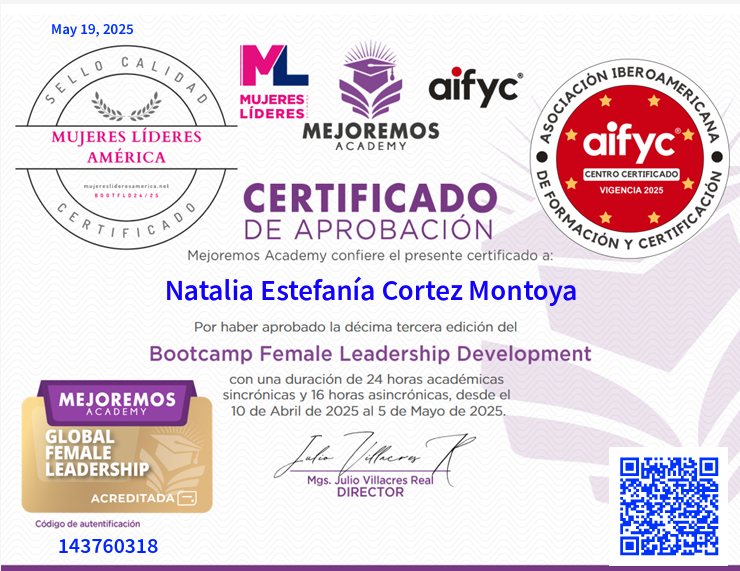 - Global Female Leadership avalado por la Organización Mujeres Líderes de América y Asociación Iberoamericana de Formación y Certificación